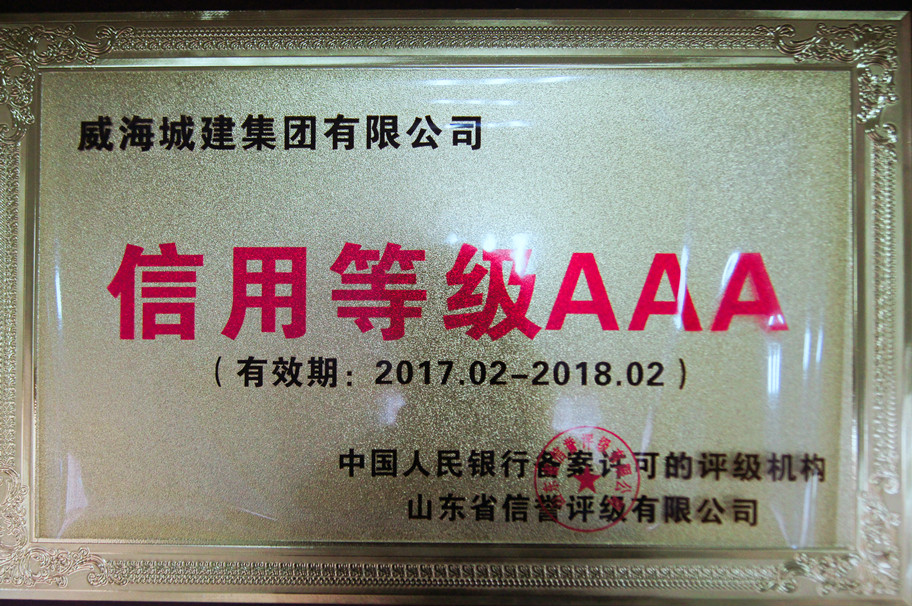 證書名稱:信用等級AAA企業(yè) 獲證單位:威海城建集團(tuán)有限公司 發(fā)證單位:山東省信譽(yù)評級有限公司
